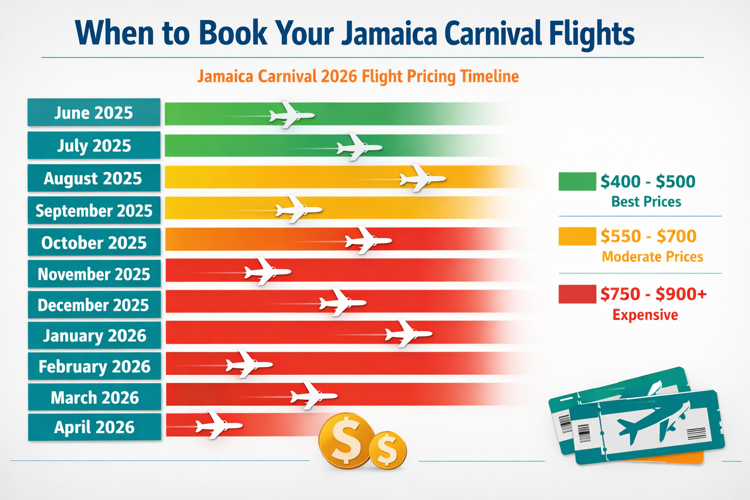IMAGE_PROMPT_2: Infographic in 1536×1024 landscape format showing “Jamaica Carnival 2026 Flight Pricing Timeline”. Visual timeline from June 2025 to April 2026 with airplane icons at different price points. Left side shows months vertically arranged, right side shows corresponding price ranges ($400-$900+) with color-coded bars (green for best prices, yellow for moderate, red for expensive). Include icons: calendar, dollar signs, plane tickets. Title at top in bold navy text “When to Book Your Jamaica Carnival Flights”. Clean, modern design with white background, teal and orange accent colors. All text clearly legible, professional chart design, nothing cropped at edges.