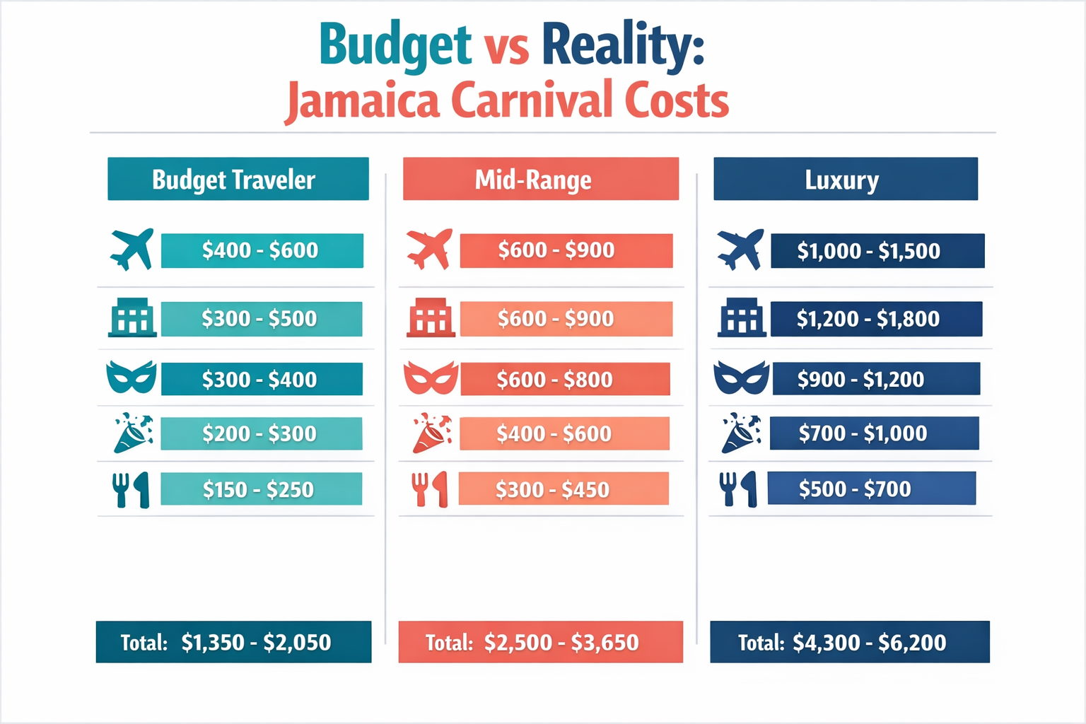 IMAGE_PROMPT_4: Landscape image 1536×1024 showing comparison chart “Budget vs Reality: Jamaica Carnival Costs”. Split into three columns labeled “Budget Traveler”, “Mid-Range”, and “Luxury” with corresponding cost breakdowns. Use icons for each category: flights (plane), accommodation (hotel), costumes (mask), fetes (party), food (fork/knife). Color-coded bars showing price ranges. Modern infographic style with teal, coral, and navy color scheme. Title in large bold text at top. Clean, professional design with white background. All text perfectly readable and aligned, numbers clearly visible, nothing cropped.