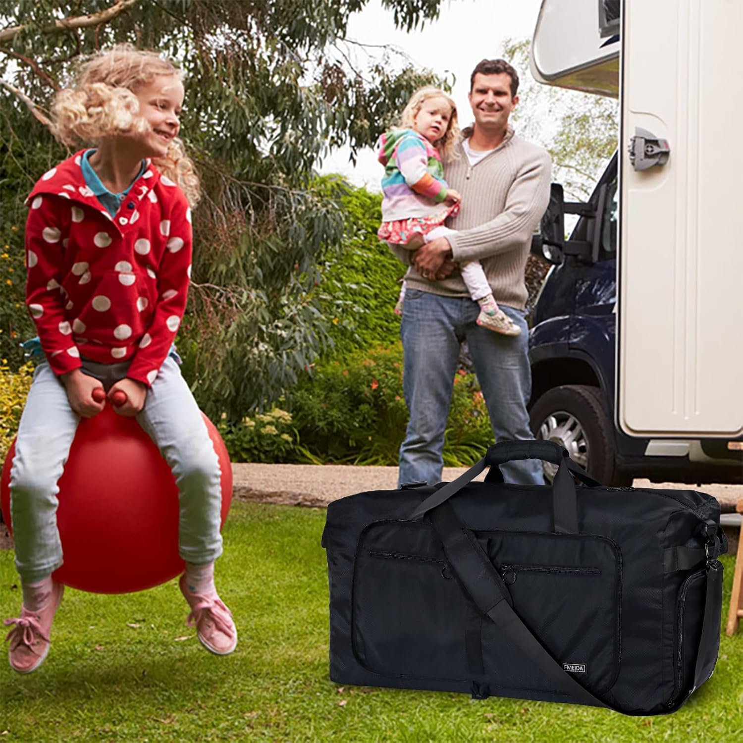 The video showcases the product in use.The video guides you through product setup.The video compares multiple products.The video shows the product being unpacked. Fmeida 65L Foldable Travel Duffle Bag Merchant Video