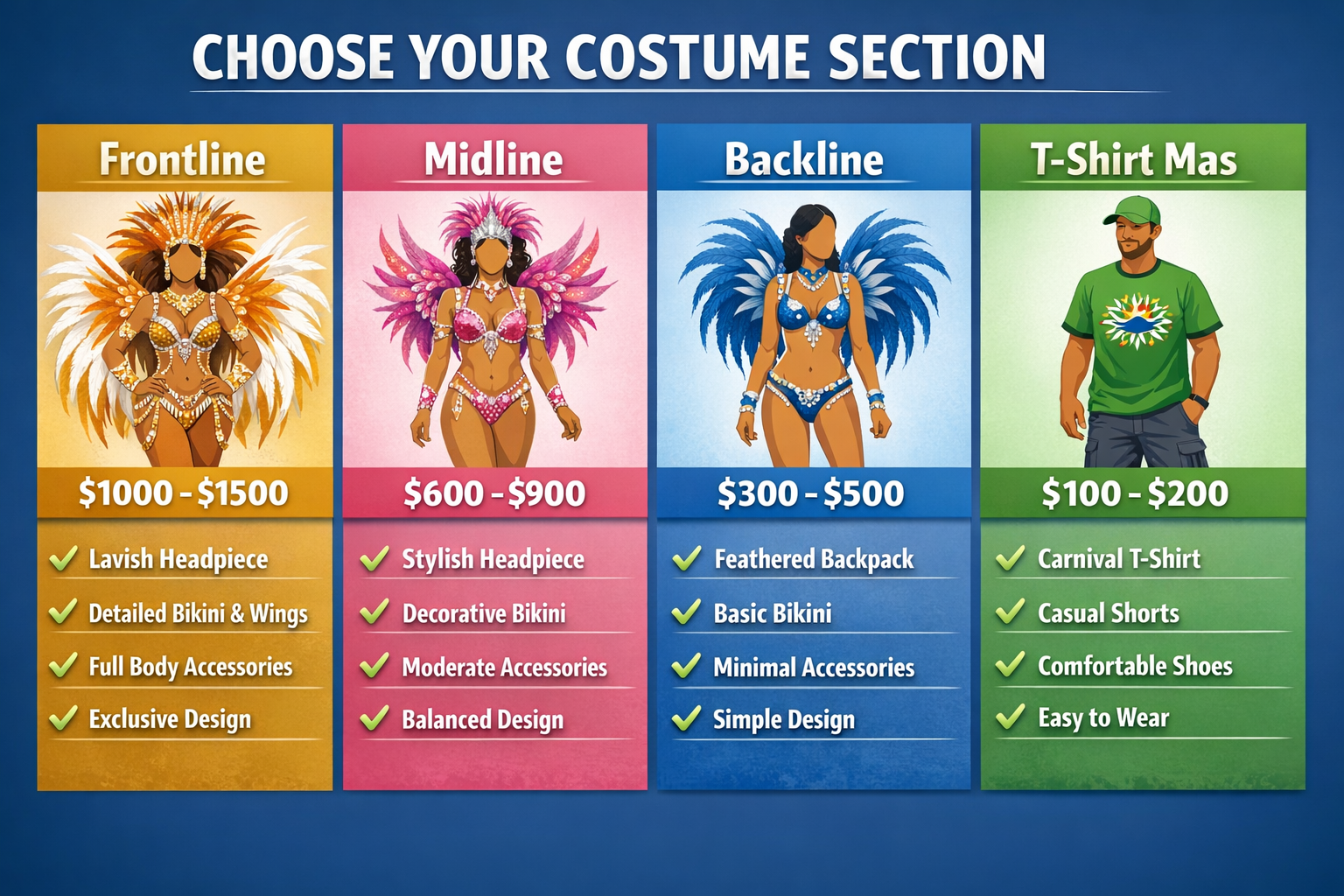 | Frontline | $600-1000 | Largest, most elaborate costumes, premium placement | Experienced masqueraders, Instagram content creators |