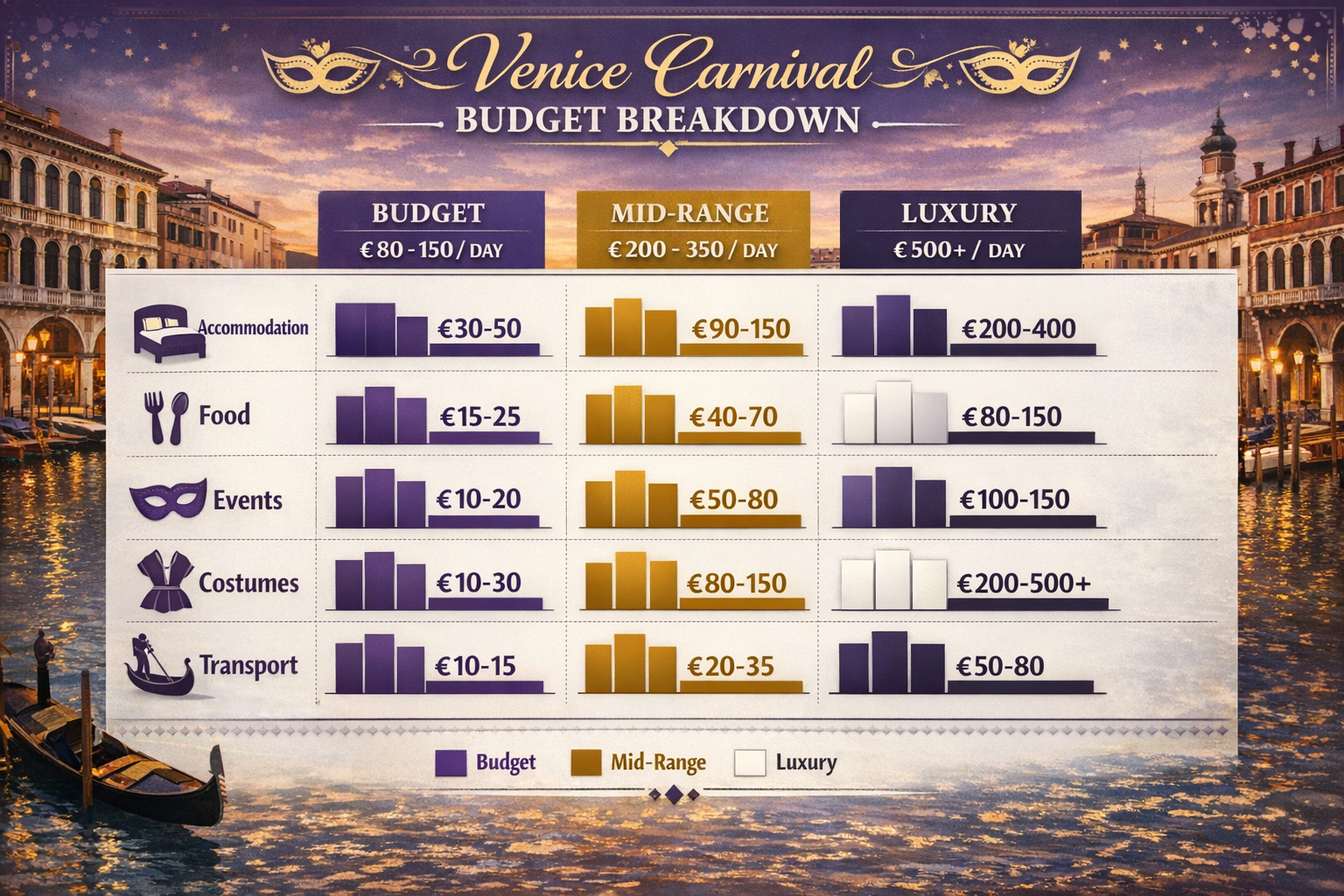 Let’s talk money. Venice isn’t cheap normally, and during carnival, prices surge. Here’s what to expect: