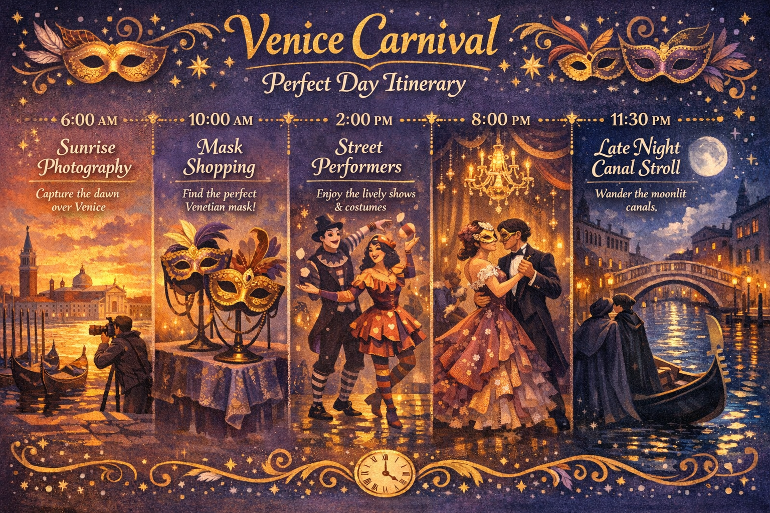 The Venice carnival events schedule is packed with activities that’ll keep you buzzing from morning until late night. Here’s your hit list: